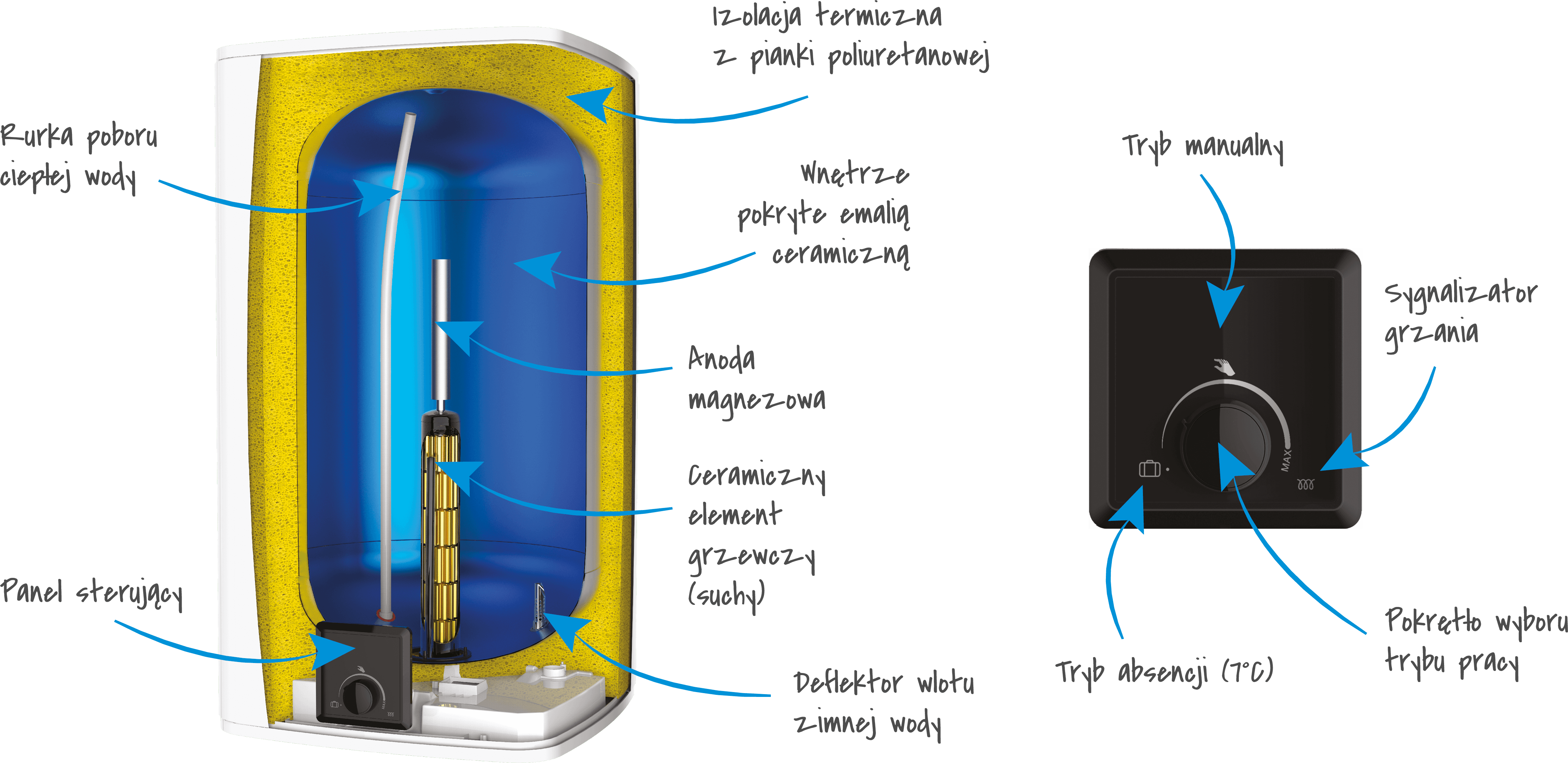 *grzałka ceramiczna - bardzo wysoka trwałość, odporność na uszkodzenia mechaniczne oraz długa żywotność grzałki, nadzwyczaj równomierne rozprowadzenie ciepła na całej swej powierzchni (4 W/cm2), podczas ewentualnej naprawy nie wymaga opróżnienia zbiornika z wody